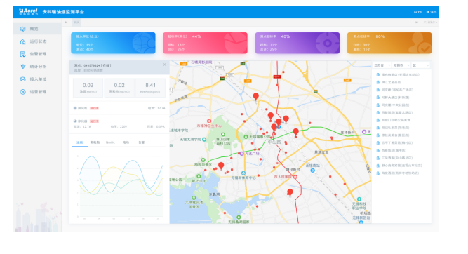 對油煙排污數據的監測,包括油煙排放濃度,顆粒物,NmHc等數值采集監測;同時對監控風機和凈化器的啟停狀態、運行數據進行監測。