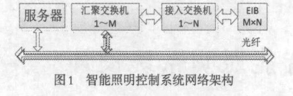 系統(tǒng)的組網(wǎng)采用支/干線模式,其中的支線連接由KNX控制總線完成,干線連接依托館所現(xiàn)有局域網(wǎng)實(shí)現(xiàn),該局域網(wǎng)連通館內(nèi)全部控制器,不用另行敷設(shè)電纜和重復(fù)定義系統(tǒng)管控方式。依托KNX/IP網(wǎng)關(guān)優(yōu)勢(shì)就能夠方便地實(shí)現(xiàn)將本系統(tǒng)接入校園主干網(wǎng),實(shí)現(xiàn)遠(yuǎn)程的服務(wù)器連網(wǎng)。智能照明控制系統(tǒng)網(wǎng)絡(luò)架構(gòu)如圖1所示。