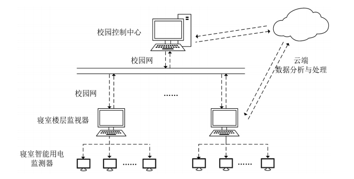 寢室智能用電智能監測器將數據上傳至宿舍管理員處的寢室樓層監視器,隨后,寢室樓層監視器再將數據上傳至云端存儲并做大數據分析。校園控制中心可以直接訪問云端獲取用電數據,也可以通過寢室樓層監視器獲取用電數據。
