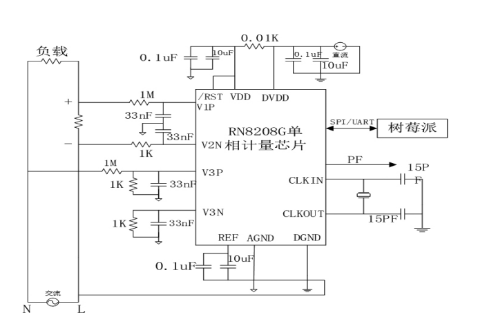 系統采用IM1277單相互感式電能質量檢測儀采集電量信息,能夠完成電能測量、采集及傳輸,準確高精度地測量單相交流電壓、電流、功率、電流及總電量等電參數。采集模塊的電路圖如圖3-2所示。220V電壓經過電壓互感器和電流互感器處理,變為較小的電流信號并通過電路傳到電能計量芯片,將模擬信號轉換為數字信號,然后通過串口送入樹莓派控制中心。