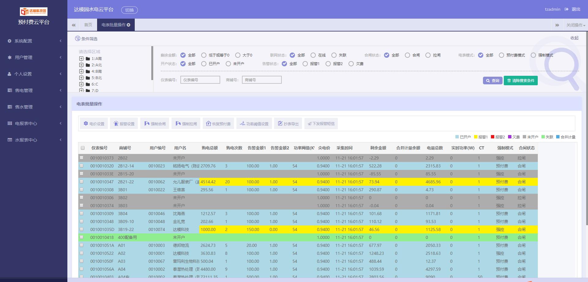 系統(tǒng)針對(duì)商鋪開(kāi)戶不僅支持一戶一表,也支持一戶掛多表的需要;同時(shí)支持和解決了項(xiàng)目改造后新老表切換時(shí),老表金額轉(zhuǎn)入的問(wèn)題;支持峰谷電價(jià),支持一表一電價(jià);可對(duì)單表設(shè)置功率過(guò)載的閾值,也支持設(shè)置單表金額報(bào)警的兩級(jí)閾值。