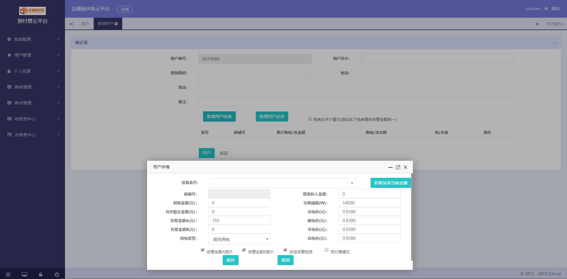 用戶通過(guò)網(wǎng)頁(yè)進(jìn)行登錄,系統(tǒng)管理員可以分配各子賬戶及相應(yīng)權(quán)限。查看系統(tǒng)日志等功能;系統(tǒng)設(shè)置:對(duì)建筑、通訊管理機(jī)、儀表及默認(rèn)參數(shù)進(jìn)行配置;用戶管理:對(duì)商鋪用戶執(zhí)行開(kāi)戶、銷戶、遠(yuǎn)程分合閘、抄表導(dǎo)出及記錄查詢等操作;售電管理:對(duì)已開(kāi)戶的表進(jìn)行遠(yuǎn)程售電、退電、沖正及記錄查詢等操作;報(bào)表中心:提供售電財(cái)務(wù)報(bào)表、用能報(bào)表、報(bào)警報(bào)表等查詢。