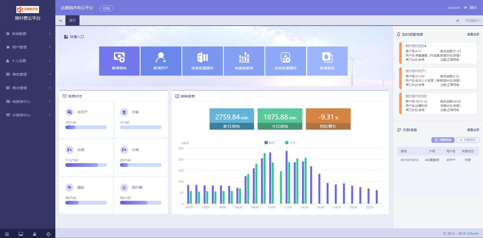系統(tǒng)登錄首頁(yè),首頁(yè)提供新增售電售水、新增開(kāi)戶、銷戶等快捷入口,實(shí)時(shí)顯示所有儀表的在線狀態(tài),以柱狀圖的形式展示整個(gè)項(xiàng)目的能耗柱狀圖等功能。