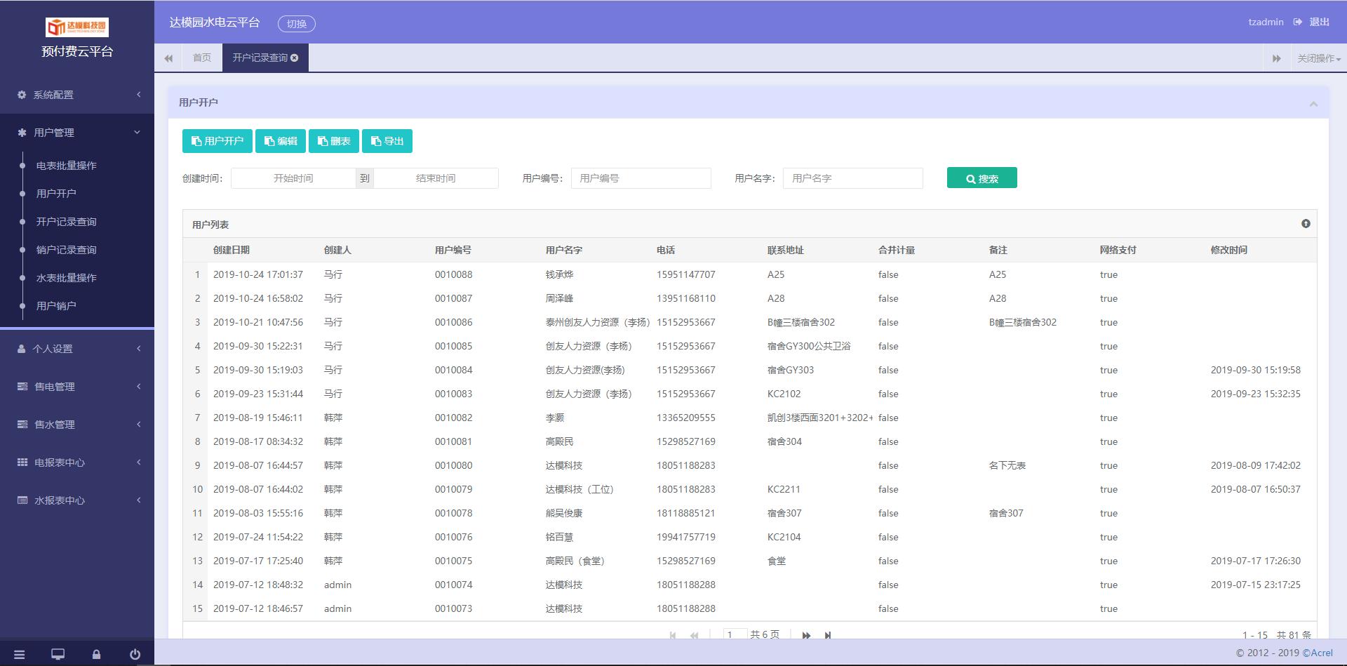 3)用戶管理:對(duì)商鋪用戶執(zhí)行開(kāi)戶、銷戶、遠(yuǎn)程分合閘、批量操作及記錄查詢等操作;